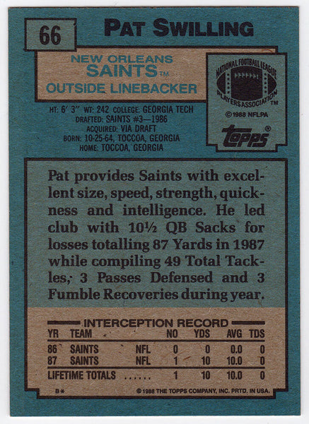 Pat Swilling Signed Saints 1988 Topps Rookie Football Card #66 - (SCHWARTZ COA)