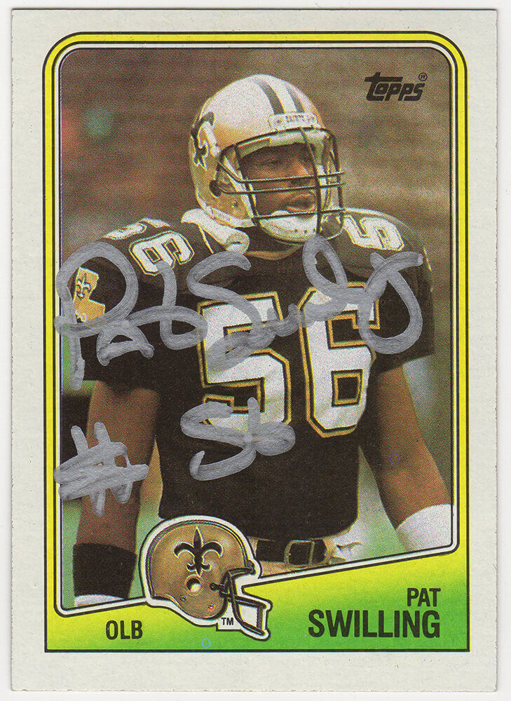 Pat Swilling signed New Orleans Saints 1988 Topps rookie football card #66. Item comes with a Schwartz Sports Memorabilia tamper-proof numbered hologram (on back of physical card) and Certificate of Authenticity which can be verified online.