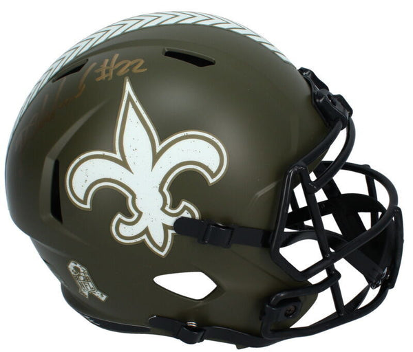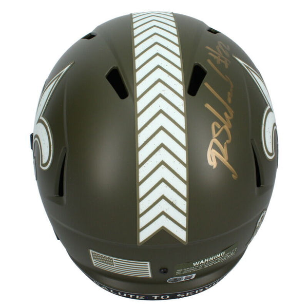 This New Orleans Saints 2022 Salute To Service full size replica speed helmet has been personally hand-signed by Rashid Shaheed. It comes with an individually numbered, tamper-evident hologram from Beckett Authentic. To ensure authenticity, the hologram can be reviewed online. This process helps to ensure that the product purchased is authentic and eliminates any possibility of duplication or fraud.Rashid Shaheed signs exclusively for Super Sports Center.