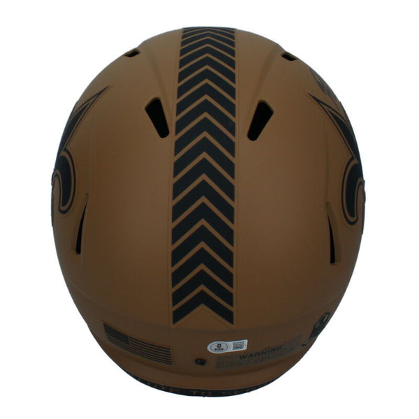 This New Orleans Saints 2023 Salute To Service full size replica Riddell Speed helmet has been personally hand-signed by Rashid Shaheed. It comes with an individually numbered, tamper-evident hologram from Beckett Authentic. To ensure authenticity, the hologram can be reviewed online. This process helps to ensure that the product purchased is authentic and eliminates any possibility of duplication or fraud.Rashid Shaheed signs exclusively for Super Sports Center.