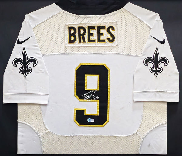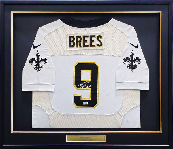 This is a framed White Nike New Orleans Saints Jersey, approximately 31x36 with the frame, that has been hand signed by Drew Brees. There are marks on this jersey. This item has been certified authentic by Beckett Authentication (BAS) and comes with their tamper-proof QR Code hologram that can be verified on the Beckett-authentication.com.