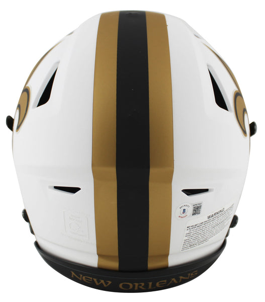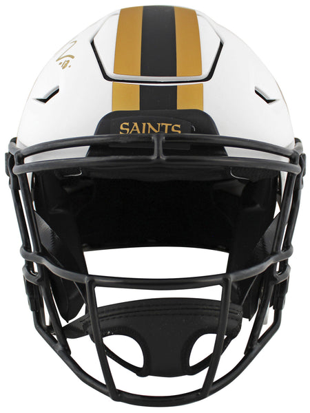 This Autographed Alternate Lunar Authentic Riddell Speed Flex Full Size Helmet has been Personally Signed by Michael Thomas of the New Orleans Saints. This item is 100% Authentic to include a hologram by Beckett Authentication Services. This item will come with the new Beckett Authentication hologram that has a scannable QR code rather than the traditional COA. If you would like to have a COA, you are welcome to reach out to Beckett for a printed certification once you receive your item. This is a BAS Witnessed Protection Program item which means a Beckett Authentication Service representative was present when this item was being signed. We conducted an autograph signing with Michael Thomas where multiples of the same item were signed. While the photographs are representative of this item, the size, placement and strength of the signature may vary. Each item is hand signed, therefore, each autograph is unique. This item can be verified through BAS Witnessed.