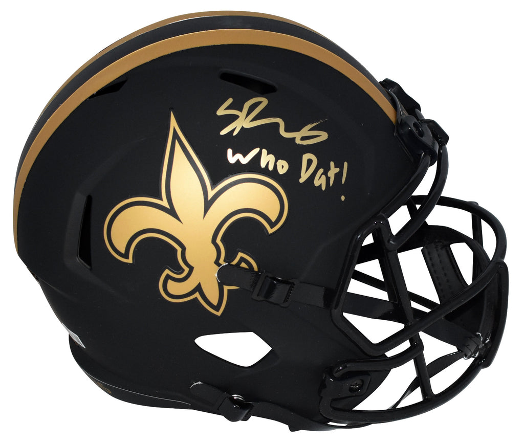 Spencer Rattler, star quarterback for the New Orleans Saints, has hand signed this Saints Riddell Speed Eclipse full-size replica helmet at a private signing. He included the inscription "Who Dat!" with his signature. This item is authenticated by Beckett Authentication Services and was signed in the presence of one of their representatives. Their tamper-evident hologram featuring a QR code and serial number is on the item. The authenticity can be verified online by entering the serial number or scanning the QR code.Item pictured may not be the exact item you will receive. It will be similar quality, and we guarantee your satisfaction.