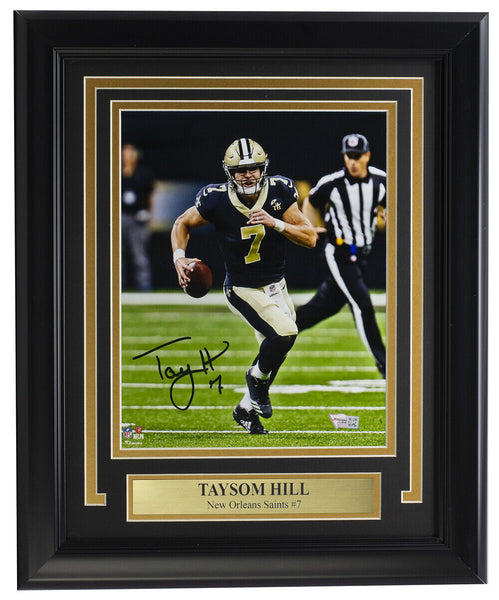 Featured is a Taysom Hill signed framed 8x10 New Orleans Saints photo. This photo was hand signed by Taysom Hill and authenticated by Fanatics authentication services. Included with the photo is a Fanatics hologram and certificate of authentication Brand new professional framing featuring double matting and engraved nameplate. The frame measures approximately 14x11 in total size, and it is ready for display. This item would make a great addition to any sports memorabilia collection.. SPECIFICATIONS Autographed By: Taysom Hill Team: New Orleans Saints Sport: Football Authentication: Fanatics Authentic