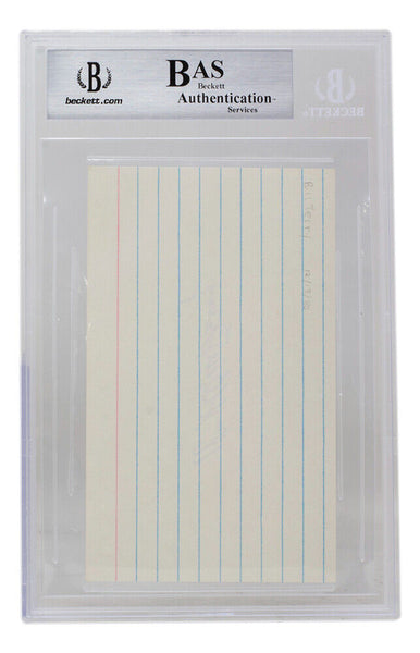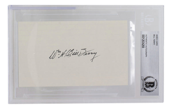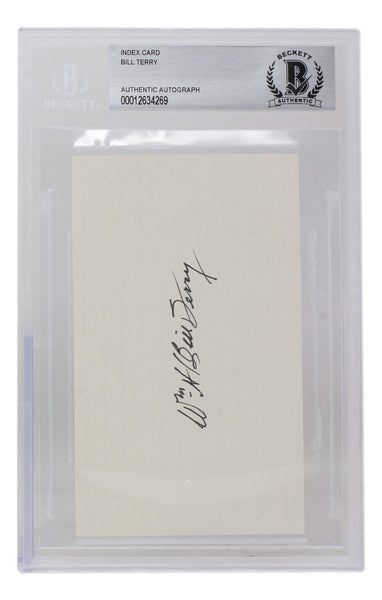 Featured is a Bill Terry New York Giants index card. This index card has been signed by Bill Terry and slabbed and authenticated by Beckett authentication services. This item would make a great addition to any sports memorabilia collection.. SPECIFICATIONS Autographed By: Bill Terry Team: New York Giants Sport: Baseball Authentication: Beckett Grading Services