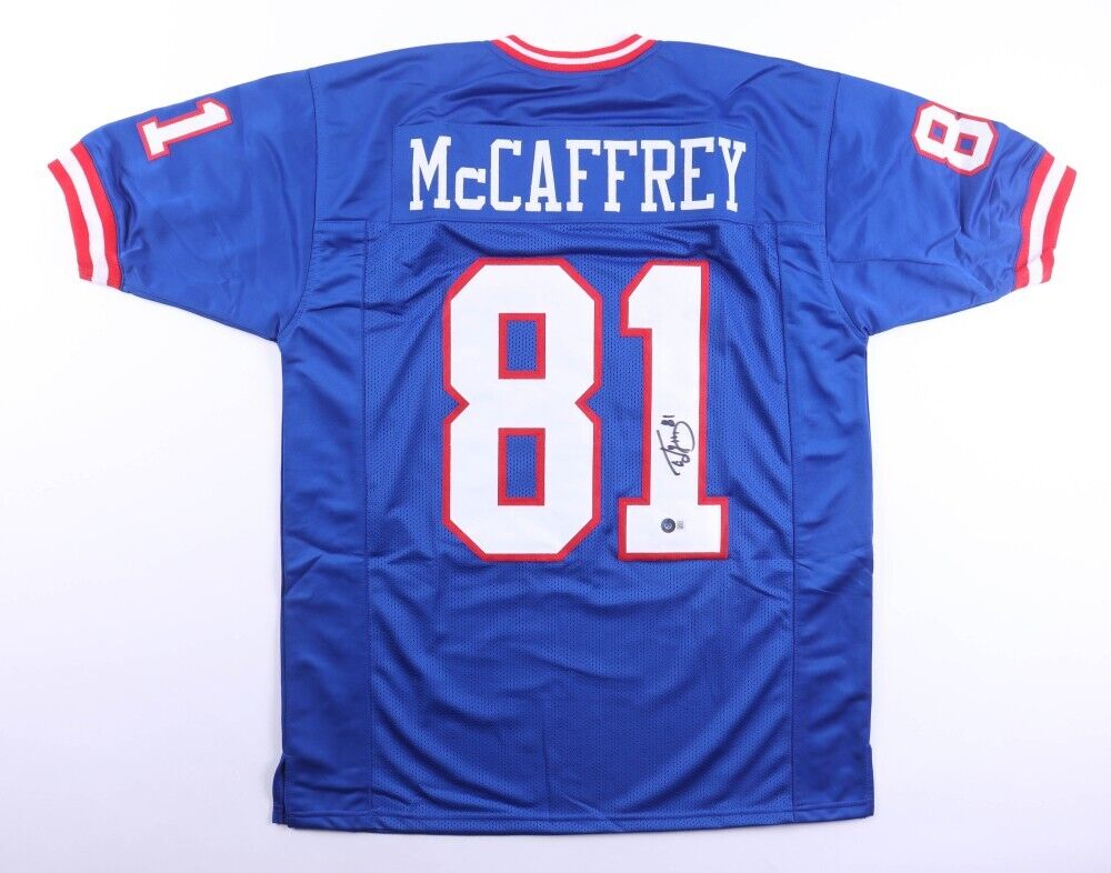 Custom on-field style jersey. Everything is sewn on, size XL. Hand-signed by Ed McCaffrey (New York Giants, San Francisco 49ers, Denver Broncos).The autograph includes an official Beckett Authentication Services serially numbered hologram and QR Code card for authenticity purposes. The signing of this item was witnessed by Beckett.Authentication: Beckett Hologram with QR Code cardCustom on-field style jerseys are a more affordable option for autograph seekers. These jerseys do not have any brand name or tags and are made in the Philippines. They feature stitched on names and numbers and are made to look very similar to the on-field jerseys that the players wear. These custom jerseys are very commonly used in the memorabilia industry.