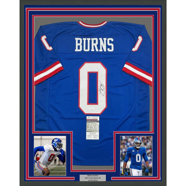 Framed Autographed/Signed Brian Burns 35x39 New York Retro Blue Jersey JSA COA The item is professionally framed and matted with two 5x7 photos, measures 35x39 inches and is ready to be hung in your man cave! Photo and matting requests can be made.