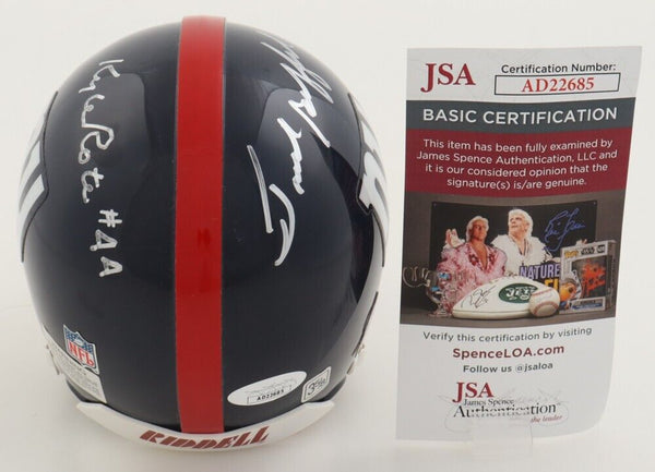 Riddell New York Giants mini helmet has been hand-signed by Frank Gifford (HOF) and Kyle Rote.The autograph includes an official James Spence Authentication (JSA) hologram and matching COA for authenticity purposes.Authentication: JSA COA