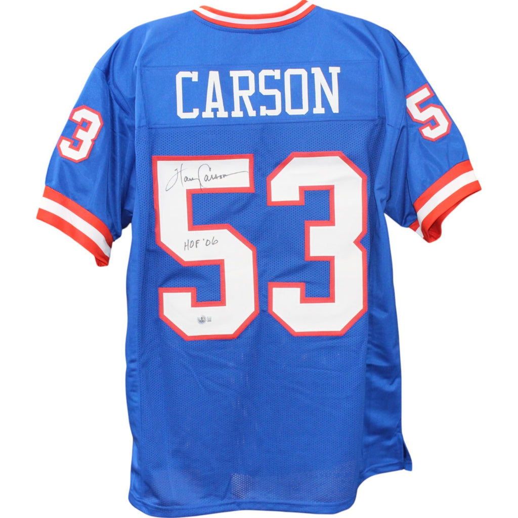 The number in the listing title is just an inventory sku for our records and is not the authentication number. The item pictured is a stock photo unless otherwise noted. This is a Pro Style Blue Size XL Jersey with sewn on numbers that was personally autographed by Harry Carson includes "HOF 06" inscription. Includes a certificate of authenticity from Beckett Authentication Services (BAS) and Denver Autographs.FREE SHIPPING within the USA on orders over $10!
