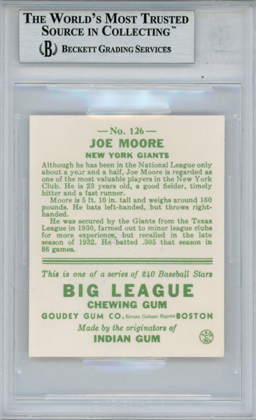 Joe Moore Signed 1983 Galasso '33 Goudey Reprint #126 Card BAS Slab 38492 The number in the listing title is just an inventory sku for our records and is not the authentication number. This is the exact item that you will receive so please see pictures for condition. This is a trading card that was personally autographed by Joe Moore. This has been professionally slabbed by Beckett Authentication Services (BAS) and includes a certificate of authenticity from Denver Autographs.