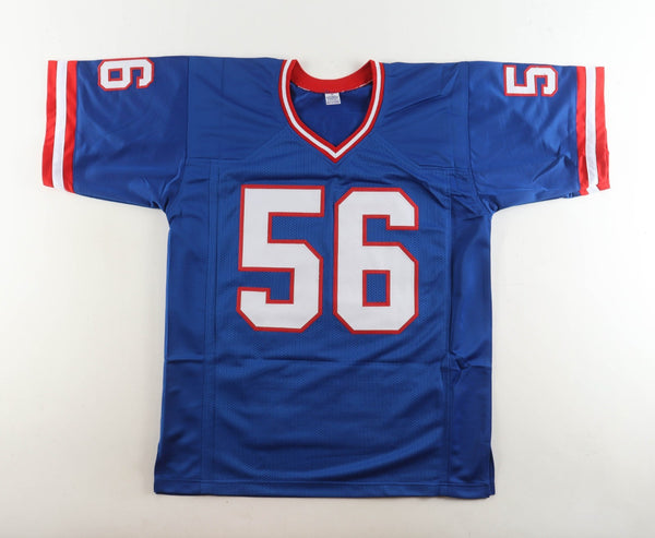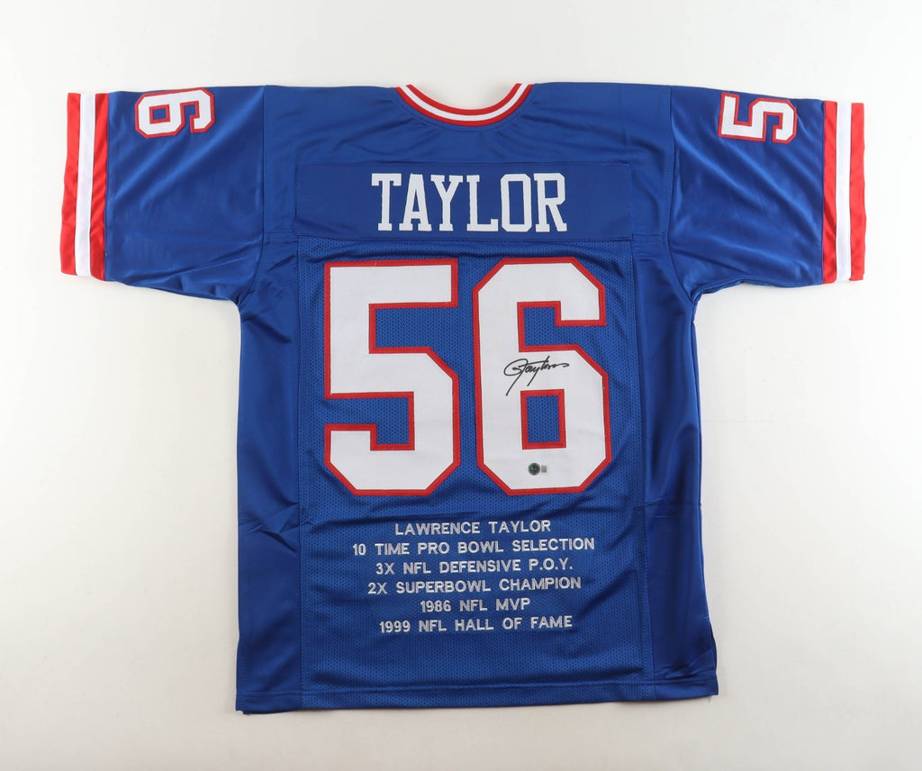 Custom on-field style jersey. Everything sewn on, size XL. Hand-signed by Lawrence Taylor (HOF). The lot / autograph(s) includes an official Beckett Authentication Services serially-numbered hologram and Scannable QR Code card for authenticity purposes. The signing of this item was witnessed by Beckett.Authentication: Beckett Hologram with Scannable QR Code card
