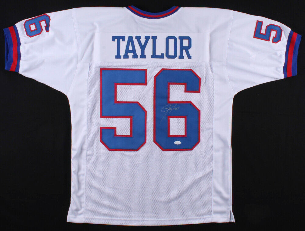 Custom on-field style jersey. Everything sewn on, size XL. Hand-signed in silver paint pen by Lawrence Taylor (Giants HOF). The autograph includes an official James Spence Authentication (JSA) hologram and matching COA for authenticity purposes. The signing of this item was witnessed by JSA.Authentication: JSA COA