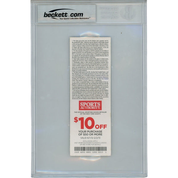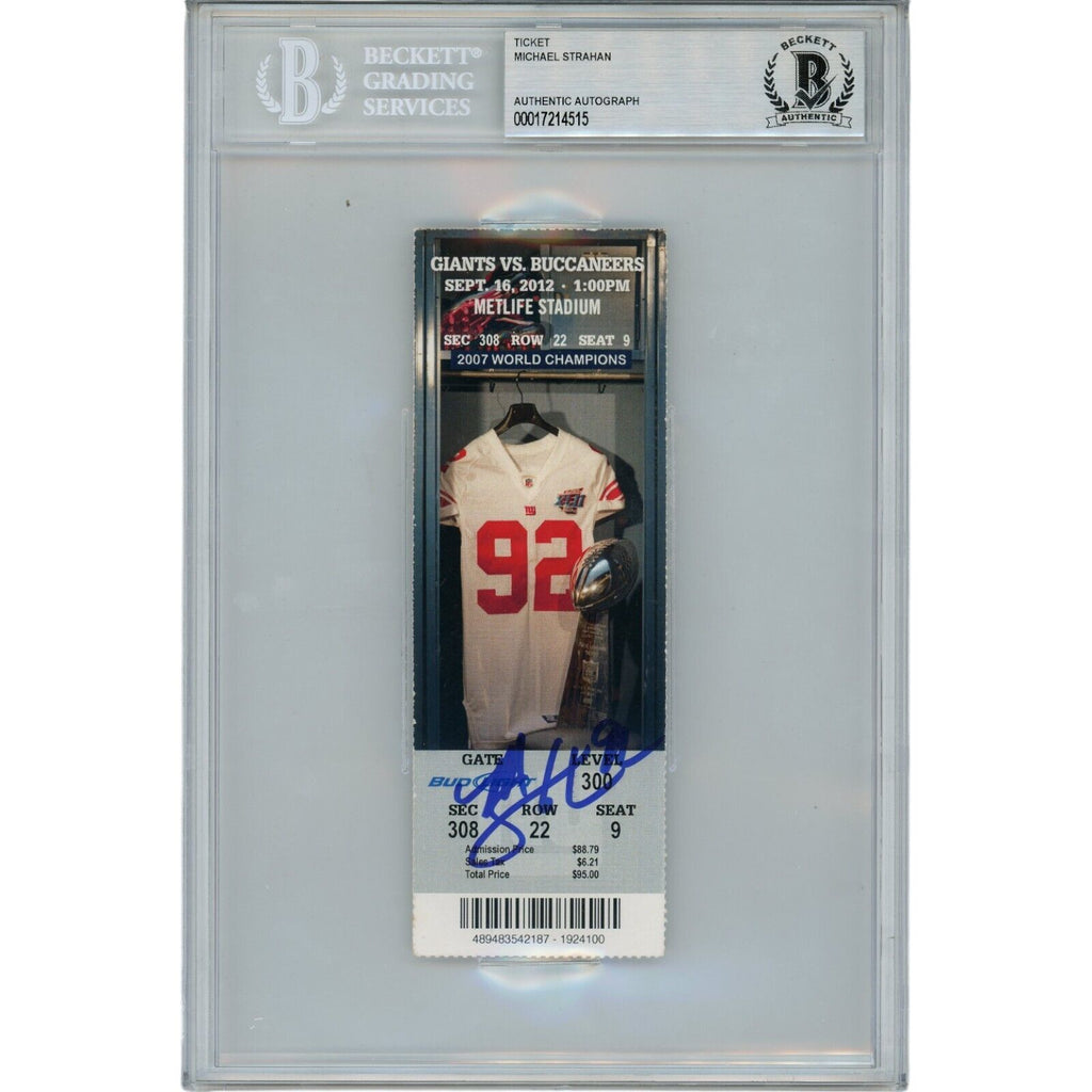The number in the listing title is just an inventory sku for our records and is not the authentication number. The item pictured is the exact item you will receive, please see photos for condition. This is a New York Giants 09/16/2012 vs. Buccaneers Slabbed Ticket Stub that was personally autographed by Michael Strahan. Includes a certificate of authenticity from Beckett Authentication Services (BAS) and Denver Autographs.