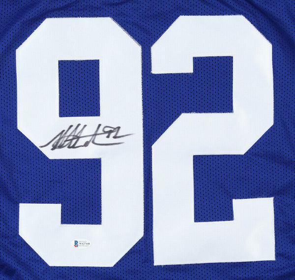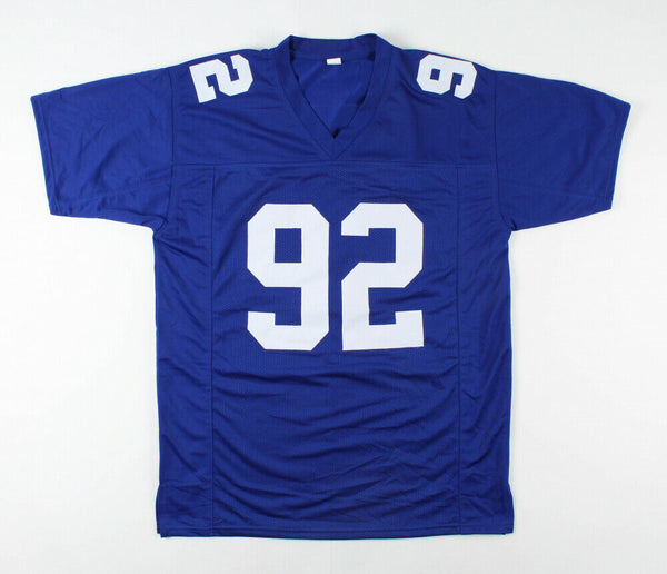 Custom on-field style jersey. Everything is sewn on, size XL. Hand-signed by Michael Strahan (HOF). The lot / autograph(s) includes an official Beckett Authentication Services serially numbered hologram and matching COA for authenticity purposes.Authentication: Beckett COA