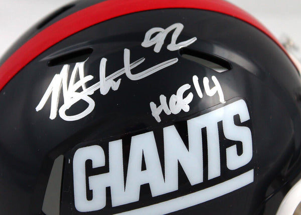 Michael Strahan Autographed New York Giants 81-99 Speed Mini Helmet W/HOF-Beckett W Hologram *Silver This is a hand autographed helmet of Michael Strahan of the New York Giants. This is a Riddell Football 81-99 Speed Mini Helmet. Inscribed with HOF. This item has a Beckett Witnessed Authentication, which comes with a numbered hologram and a QR code for verification. You can view this item on the Beckett Authentication website and it shows when and where the item was signed. It was signed either at a public autograph appearance or a private signing. This is a stock photo of the item. Although you may not receive this exact item, the item you receive is virtually identical and brand new in great shape.