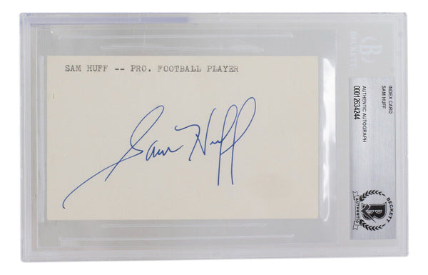 Featured is a Sam Huff New York Giants index card. This index card has been signed by Sam Huff and slabbed and authenticated by Beckett authentication services. This item would make a great addition to any sports memorabilia collection.. SPECIFICATIONS Autographed By: Sam Huff Team: New York Giants Sport: Football Authentication: Beckett Grading Services