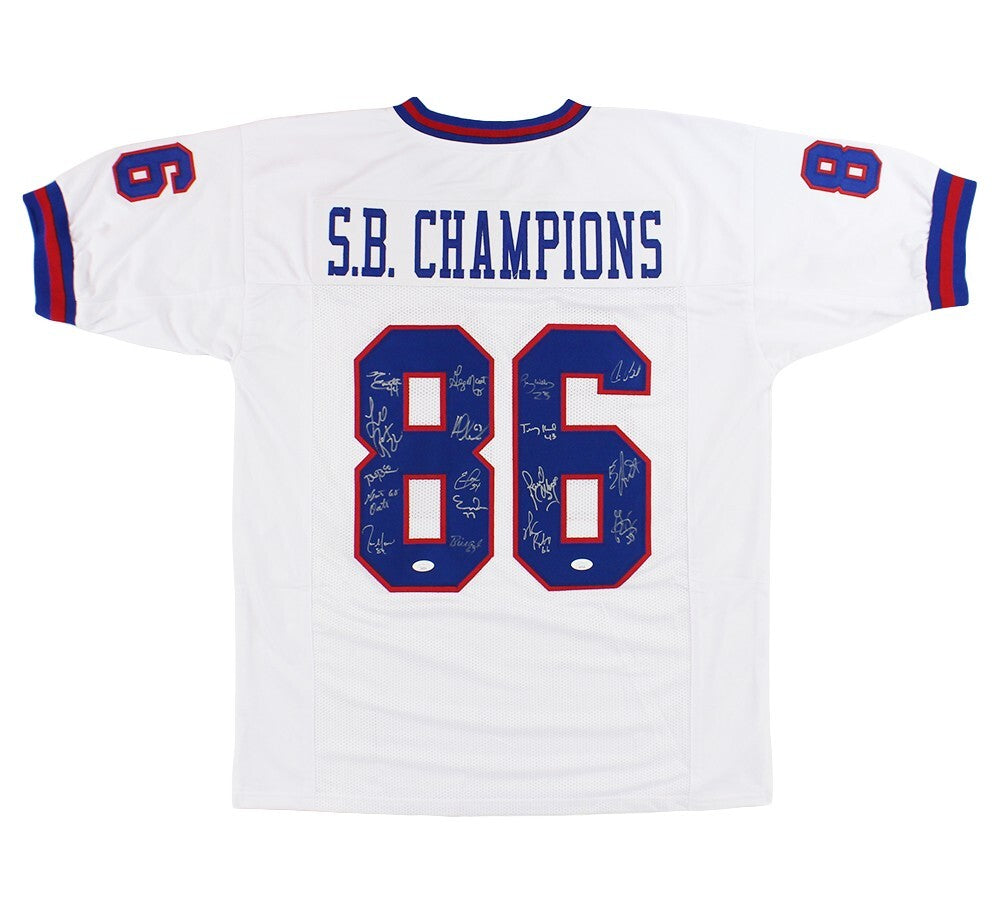 A New York Custom White Jersey hand signed by Maurice Carthon, Lee Kenny, Brad Benson, Bart Oates, Lionel Manuel, George Martin, Elvis Patterson, Eric Dorsey, Billy Ard, Perry Williams, Terry Kinard, Raul Allegre, William Roberts, Gary Reasons, Byron Hunt, and Jim Burt. The item and signature are in excellent condition. AUTHENTICATION: Your item is tagged with a SmarTag powered by Prova Technology, which gives you digital access to your items authentication records, which includes a proof picture from the signing.