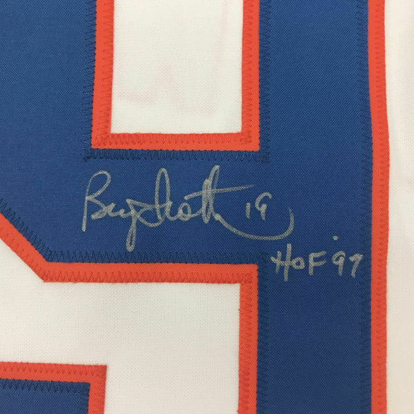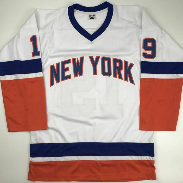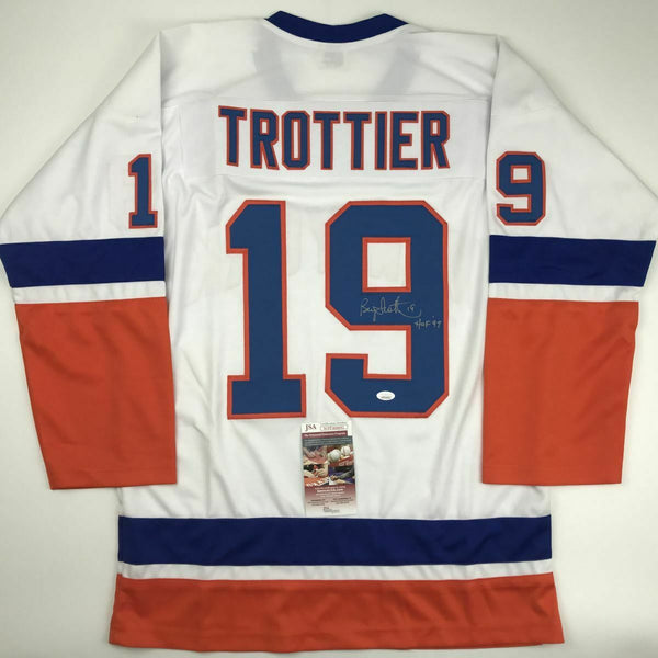 Autographed/Signed BRYAN TROTTIER HOF 97 New York White Hockey Jersey JSA COA This is a custom jersey and was not manufactured by or in any manner associated with any professional sports league or manufacturer. This custom jersey carries no professional sports league designation. The item is intended to be an autographed collectible. Reference of team in the title is to allow the purchaser a point of association. The custom jersey displays the name, number and authenticated signature of the player. This item in no way is affiliated with or connected to any professional sports organization. The autograph, as always is guaranteed to be authentic and has been certified as authentic by a third-party, trusted authenticator. Size is XL unless otherwise noted.