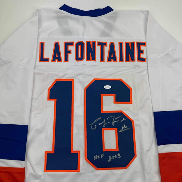 Autographed/Signed Pat Lafontaine HOF 03 New York White Hockey Jersey JSA COA Jersey has no brand names or logos. This is a custom jersey and was not manufactured by or in any manner associated with any professional sports league or manufacturer. This custom jersey carries no professional sports league designation. The item is intended to be an autographed collectible. The custom jersey displays the name and number of the player. This item in no way is affiliated with or connected to any professional sports organization. Size is XL.