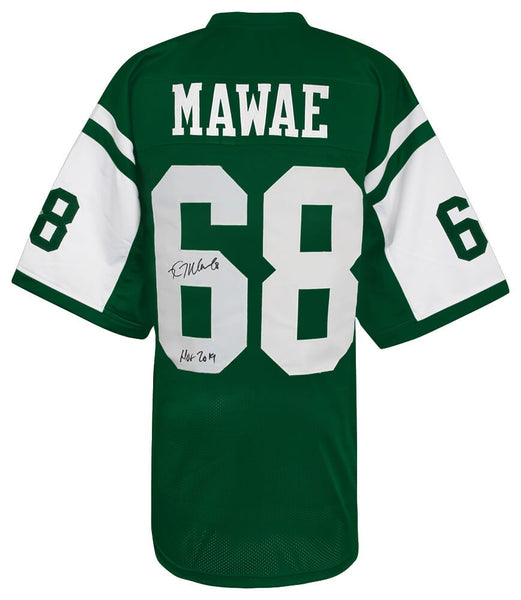 Kevin Mawae signed green throwback custom football jersey with 'HOF 2019' inscription. Item comes with a Schwartz Sports Memorabilia tamper-proof numbered hologram and Certificate of Authenticity which can be verified online. Jersey is size XL.