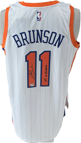 Jalen Brunson hand signed Nike Swingman New York Knicks City Connect jersey. Hand signed by the Knicks star point guard Jalen Brunson in bold black and inscribed "NY or Nowhere". RARE inscription!! Jersey is an adult size 48 Large. Comes new with all original tags! Very cool City connect design.
