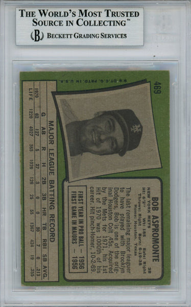 Bob Aspromonte Autographed 1971 Topps #469 Trading Card Beckett Slab 38489 The number in the listing title is just an inventory sku for our records and is not the authentication number. This is the exact item that you will receive so please see pictures for condition. This is a trading card that was personally autographed by Bob Aspromonte. This has been professionally slabbed by Beckett Authentication Services (BAS) and includes a certificate of authenticity from Denver Autographs.