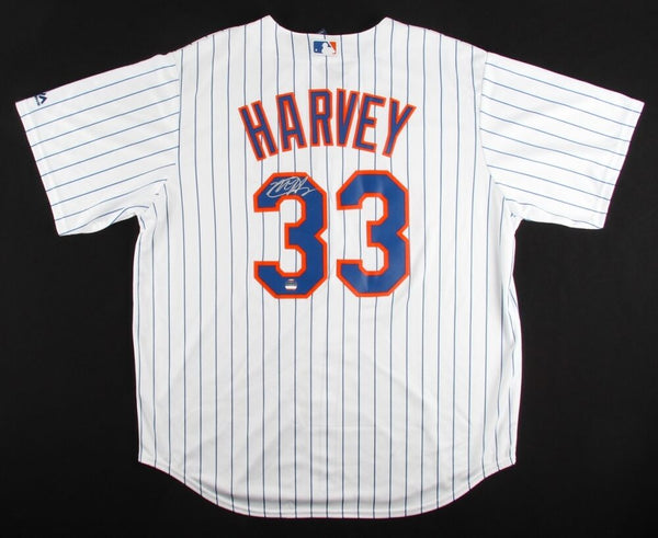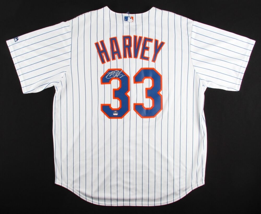 Majestic cool base on-field style jersey. Everything is sewn on, size Adult XL. Hand-signed in silver paint pen by Matt Harvey. The autograph includes an official LOJO Sports Marketing Inc. hologram and matching COA for authenticity purposes.Authentication: LOJO COA