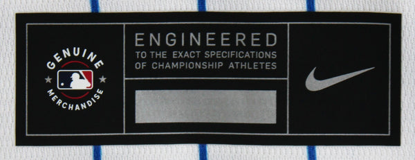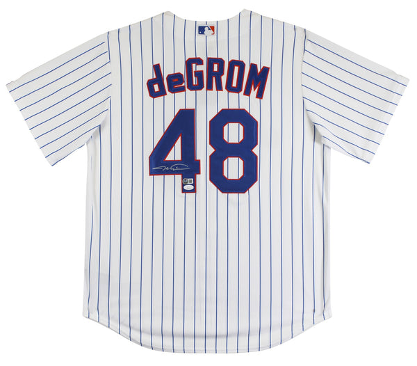 This Autographed White Nike Jersey has been Personally Signed by Jacob deGrom of the New York Mets. This item is 100% Authentic to include a hologram by Beckett Authentication Services. This item will come with an affixed Beckett Authentication Services (BAS) authentication sticker, which includes a scannable QR code to verify authenticity. Please note that Beckett no longer provides serial-numbered COA cards, and the attached BAS sticker will serve as the complete authentication for this item. The authenticity can be verified on Beckett Authentication Services website. This is a X-Large sized Jersey. The jersey was also previously authenticated by JSA, but it will not come with its matching JSA card. Its authenticity can still be searched and verified in JSA's database.