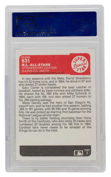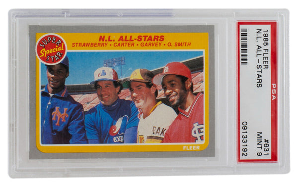 Featured is a National League All Stars 1985 Topps #631 baseball card. This card has been slabbed, authenticated, and graded by PSA authentication services, in which the card was graded a Mint 9 This item would make a great addition to any sports memorabilia collection! SPECIFICATIONS Autographed By: Team: New York Mets Sport: Baseball Authentication: Professional Sports Authenticator (PSA)