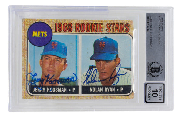 Featured is a Nolan Ryan and Jerry Koosman signed 1968 Topps New York Mets baseball card #177. This card has been signed and has been slabbed and authenticated by Beckett authentication services grading the autographs a 10. This item would make a great addition to any sports memorabilia collection. SPECIFICATIONS Autographed By: Alex Bohm Team: New York Mets Sport: Baseball Authentication: Beckett Grading Services