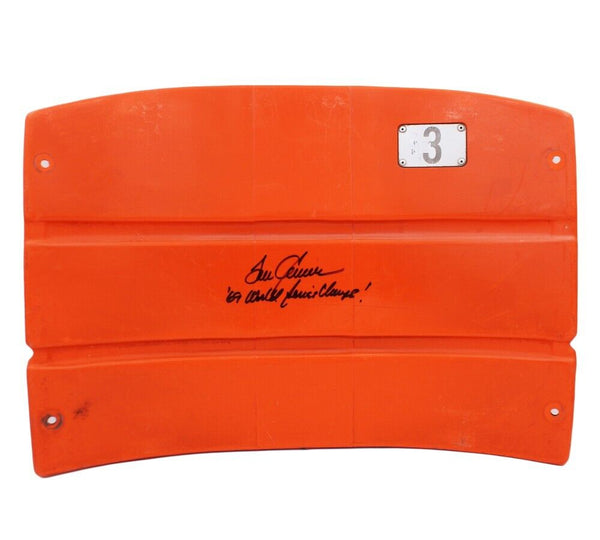 A New York Mets Shea Stadium Orange #3 Seat Back hand signed by Tom Seaver. The signature is in excellent condion. The seat back is in used condition. In addition to signing his name, Tom also inscribe "'69 World Series Champs" on the item. Tom is a former professional baseball player. He played 20 season as a pitcher in the MLB, inducted into the Baseball Hall of Fame, and is in the Mets and the Reds Hall of Fame. AUTHENTICATION: The item is accompanied by MAB Celebrity Services Hologram & Tom Seaver Official Player Hologram.