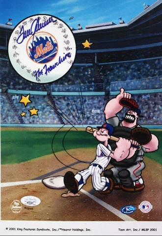 This autographed cut signature has been personally hand-signed by Tom Seaver of the New York Mets. The cut comes with (1) unsigned photo of Seaver in a framed display measuring 9"x11". This autograph is certified by James Spence Authentication (JSA). It comes with the numbered hologram and matching Certificate of Authenticity. George Thomas Seaver, nicknamed "Tom Terrific" and "the Franchise", was a pitcher who played 20 seasons in the Major Leagues for the New York Mets, Cincinnati Reds, Chicago White Sox, & Boston Red Sox. He was the most iconic player in Mets history and played a significant role in their victory in the 1969 World Series victory over the Baltimore Orioles.Tom Passed away in his sleep from complications of dementia and the virus on August 31, 2020, at the age of 75.