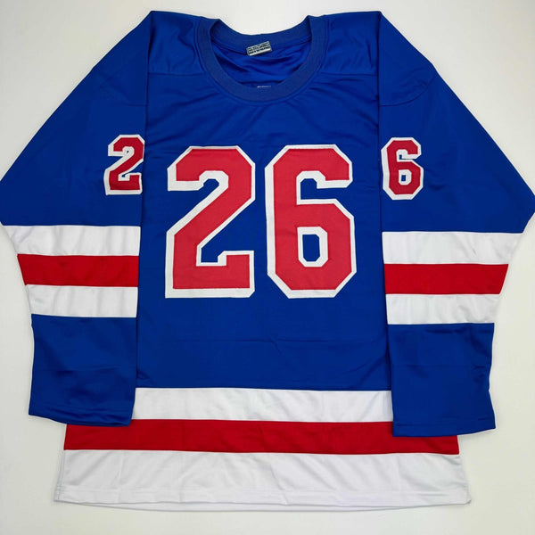 Autographed/Signed Jimmy Vesey New York Blue Hockey Jersey JSA COA Jersey has no brand names or logos. This is a custom jersey and was not manufactured by or in any manner associated with any professional sports league or manufacturer. This custom jersey carries no professional sports league designation. The item is intended to be an autographed collectible. The custom jersey displays the name and number of the player. This item in no way is affiliated with or connected to any professional sports organization. Size is XL.