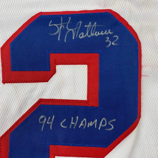 Autographed/Signed Stephane Matteau 94 Champs New York White Jersey JSA COA Jersey has no brand names or logos. This is a custom jersey and was not manufactured by or in any manner associated with any professional sports league or manufacturer. This custom jersey carries no professional sports league designation. The item is intended to be an autographed collectible. The custom jersey displays the name and number of the player. This item in no way is affiliated with or connected to any professional sports organization. Size is XL.