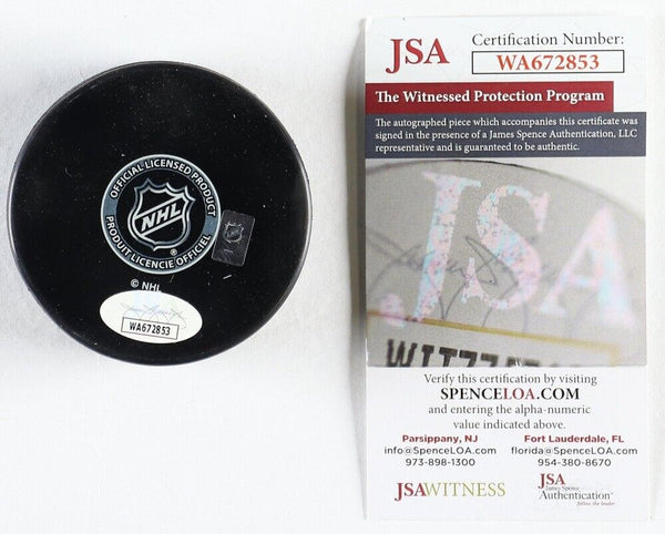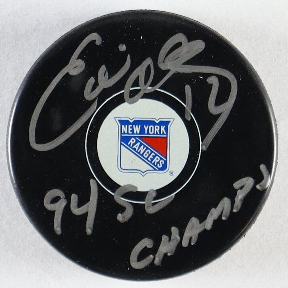 New York Rangers logo hockey puck has been hand-signed and inscribed by Eddie Olczyk.The autograph includes an official James Spence Authentication (JSA) hologram and matching COA for authenticity purposes. The signing of this item was witnessed by JSA.Authentication: JSA COA