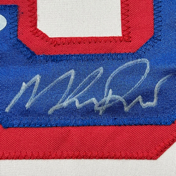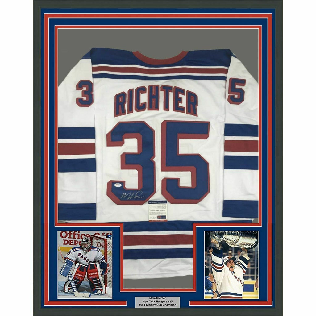 FRAMED Autographed/Signed MIKE RICHTER 33x42 New York White Jersey PSA/DNA COA The item is professionally framed & matted with two 8x10 photos, measures 33"x42" and is ready to be hung in your man cave! NOTE: COA card will be mounted on the back of the frame, not inside it on top of the jersey as seen in the picture.