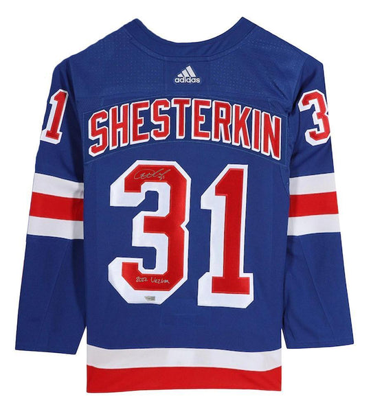 This authentic adidas new york rangers jersey has been personally hand-signed by igor shesterkin with the inscription "2022 vezina." it is officially licensed by the national hockey league and comes with an individually numbered, tamper-evident hologram from fanatics authentic. to ensure authenticity, the hologram can be reviewed online. this process helps to ensure that the product purchased is authentic and eliminates any possibility of duplication or fraud.made in the usapersonally autographed by igor shesterkinfanatics authentic presented by mounted memoriesincludes tamper-evident hologram to ensure authenticityofficially licensed this product is guaranteed authentic and includes a fanatics certificate of authenticity and an accompanying tamper-evident fanatics hologram.