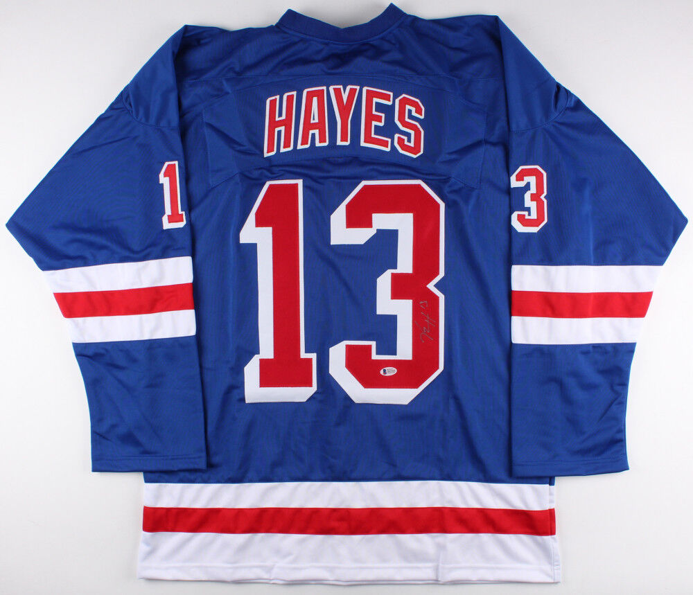 Custom on-ice style jersey. Everything sewn on, size XL. Hand-signed in silver paint pen by Kevin Hayes. The autograph includes an official Beckett Authentication Services serially numbered hologram and matching COA for authenticity purposes.Authentication: Beckett COA