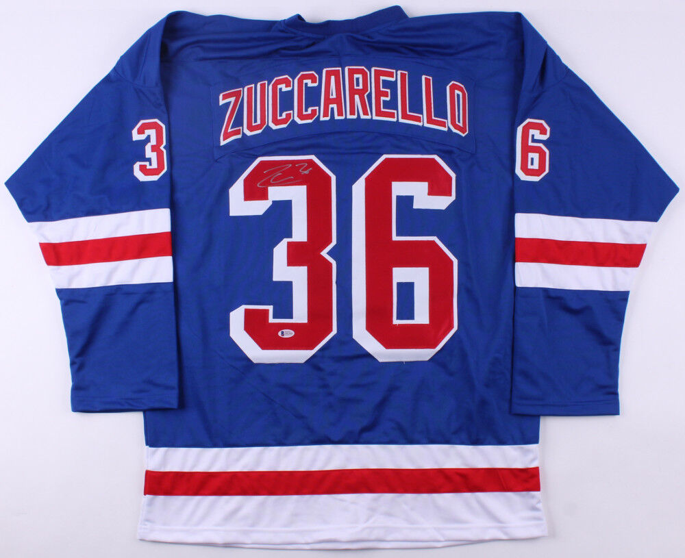 Custom on-ice style jersey. Everything sewn on, size XL. Hand-signed in silver paint pen by Mats Zuccarello. The lot / autograph(s) includes an official Beckett Authentication Services serially numbered hologram and matching COA for authenticity purposes.Authentication: Beckett COA