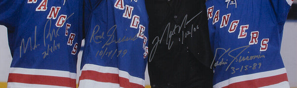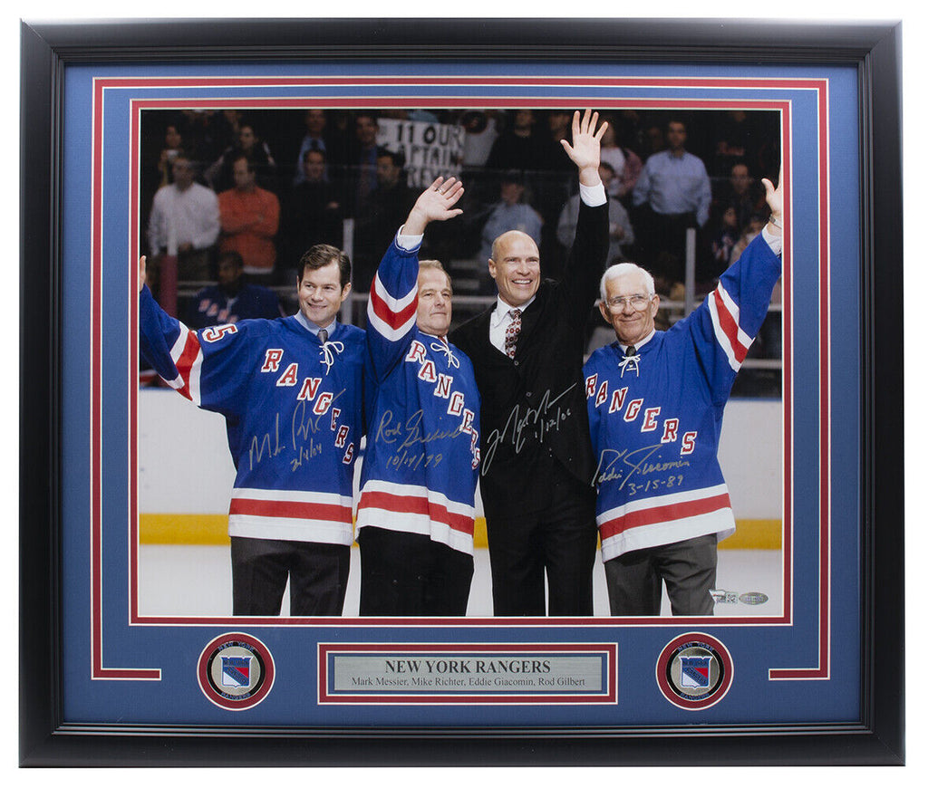 Featured is a signed Mark Messier, Mike Richter, Eddie Giacomin, and Rod Gilbert New York Rangers 16x20 photo. This photo was hand signed and authenticated by Fanatics authentication services. Included with the photo is a Fanatics hologram and certificate of authentication. This frame measures 22x27 inches in total size and is ready for display! SPECIFICATIONS Autographed By: Mark Messier Team: New York Rangers Sport: Hockey Authentication: Fanatics Authentic