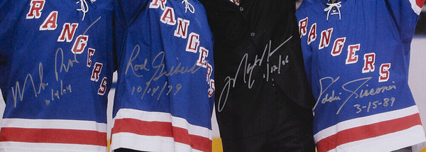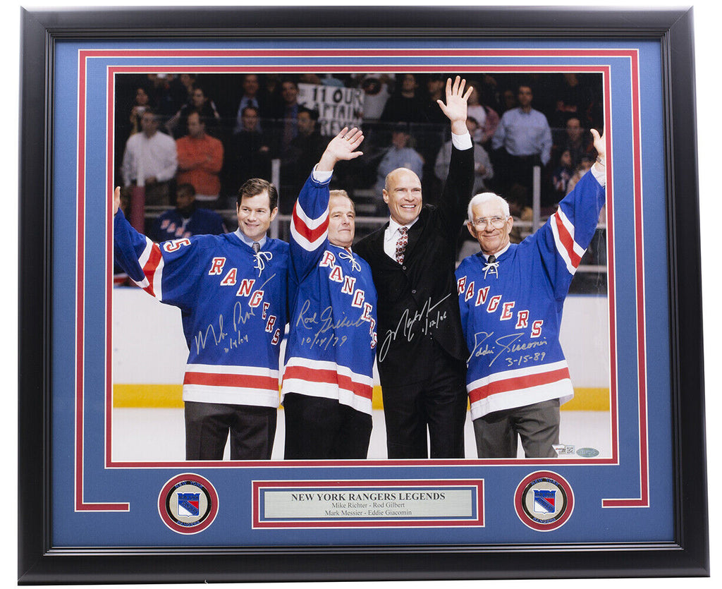 Featured is a Mike Richter Rod Gilbert Mark Messier and Ed Giacomin signed framed 16x20 New York Rangers photo. This photo was hand signed by Mike Richter Rod Gilbert Mark Messier and Ed Giacomin and has been authenticated by Fanatics authentication services. Included with the photo is a Fanatics hologram and certificate of authenticity. Brand new professional framing featuring double matting and engraved nameplate. The frame measures approximately 22x27 in total size, and it is ready for display. This item would make a great addition to any sports memorabilia collection.. SPECIFICATIONS Autographed By: Mark Messier Team: New York Rangers Sport: Hockey Authentication: Fanatics Authentic