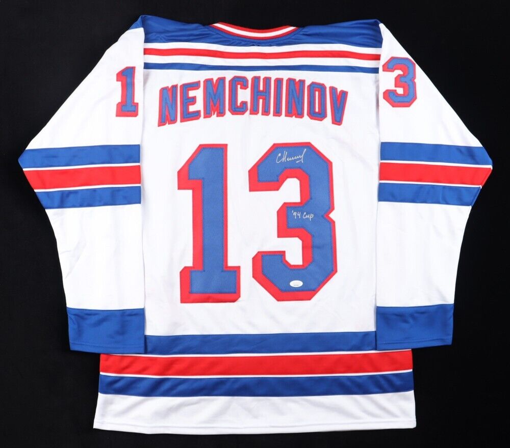 Custom on-ice style jersey. Everything sewn on, size XL. Hand-signed and inscribed in silver paint pen by Sergei Nemchinov. The autograph(s) includes an official James Spence Authentication (JSA) hologram and matching COA for authenticity purposes. The signing of this item was witnessed by JSA.Authentication: JSA COA