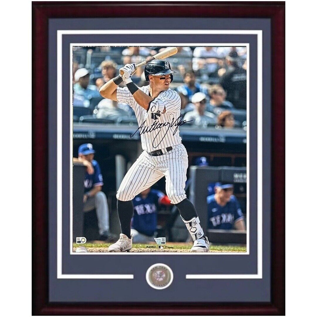 Anthony Volpe hand signed 16x20 framed photo. Hand signed in bold black on the photo of Volpe in his batting stance. This photo was signed on August 28, 2023 during Volpe's rookie season. He won the AL Gold glove in 2023 as a rookie. Framed in cherrywood with Yankees colored matting and a Yankees coin. Final dimensions are 23x30... comes ready to hang.