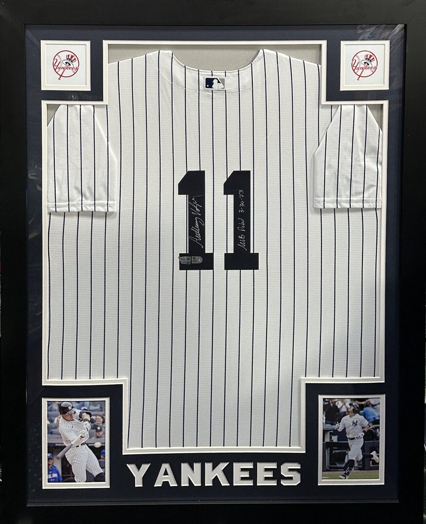 Anthony Volpe Hand Signed Yankees Nike Jersey MLB Debut 3-30-23 rookie Auto Fanatics MLB. Autograph is hand signed in bold silver and inscribed "3-30-23 MLB Debut". Beautiful autograph and inscription. YANKEES in bottom matting. 2 photos on the bottom, 1 from his 1st MLB Home Run and 1 from his first MLB grand slam. 2 Yankees logos at each top corner of the frame. Framed in black and laid on grey matting with navy blue outer and a white trim. Final framed dimensions are 33x41... comes ready to hang. Yankees #1 prospect made the 2023 Opening Day roster.