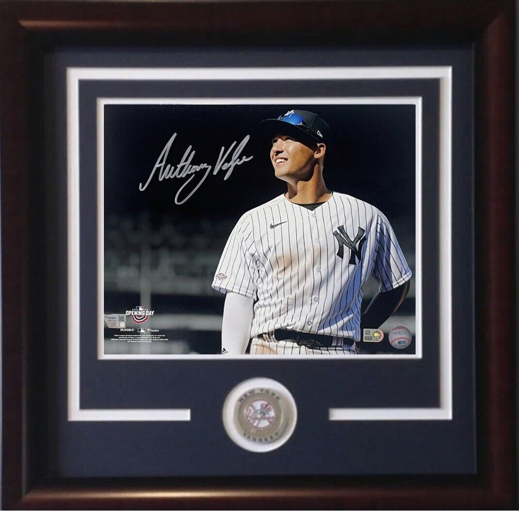 Anthony Volpe Yankees Hand Signed 11x14 Framed Opening Day Photo Rookie Auto Fanatics. Yankees top prospect rookie shortstop hand signed 11x14 framed spotlight photo with opening day logo. Autograph is hand signed in bold silver. Volpe made his MLB debut on 3/30/23. Framed in cherrywood with Yankees colored matting and a Yankees coin. Final framed dimensions are 19x23... comes ready to hang.