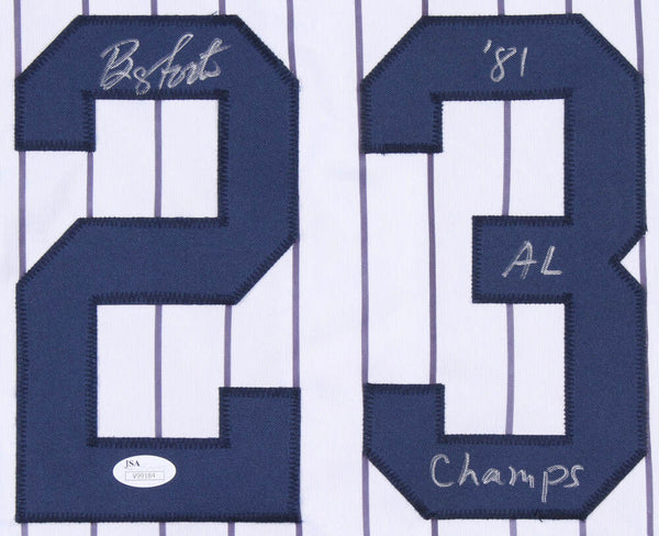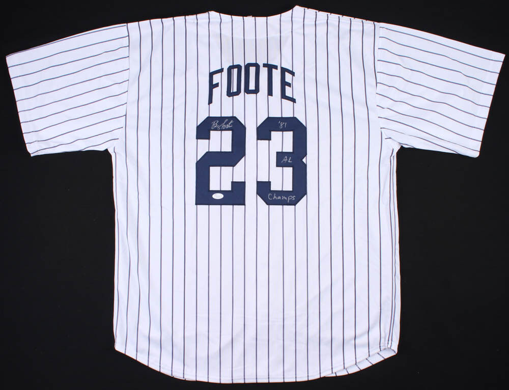 Custom on-field style jersey. Everything is sewn on, size XL. Hand-signed and inscribed in silver paint pen by Barry Foote. The lot / autograph(s) includes an official James Spence Authentication (JSA) hologram and matching COA for authenticity purposes. Authentication: JSA COA Shop our ebay store / Friendly Confines Collectibles for thousands of different autographed jerseys