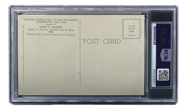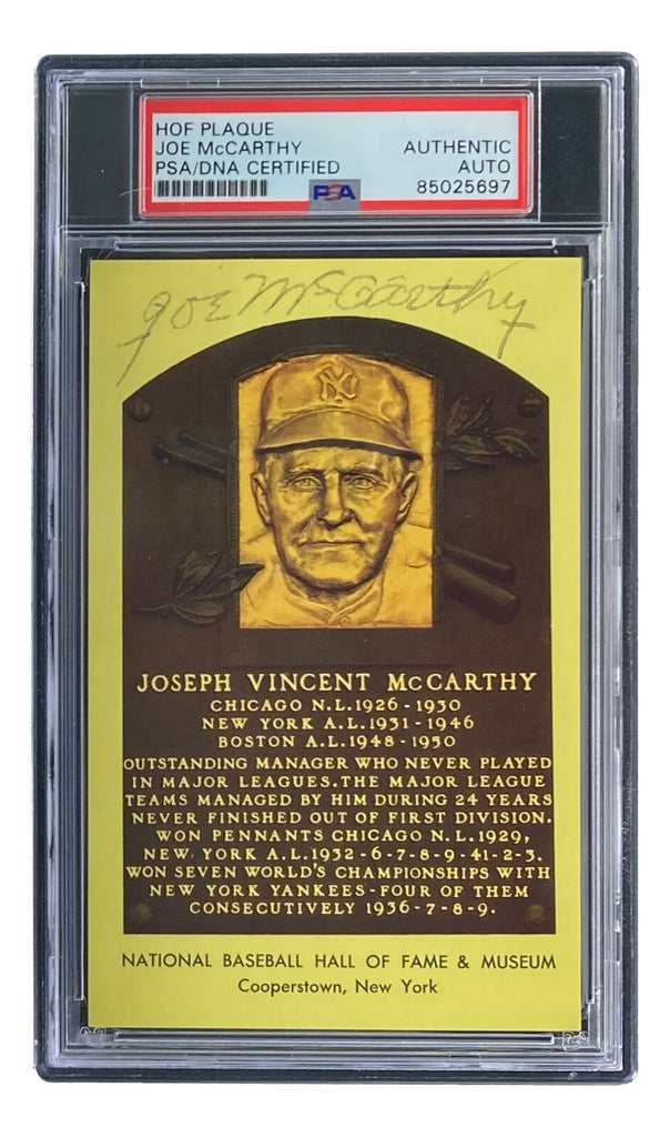 Featured is a Joe McCarthy (New York Yankees) signed 4x6 Hall Of Fame plaque card. This card has been hand signed by McCarthy and has been authenticated and encapsulated by PSA/DNA. This card would make a great addition to any sports memorabilia collection!. SPECIFICATIONS Autographed By: Joe McCarthy Team: New York Yankees Sport: Baseball Authentication: Professional Sports Authenticator (PSA)