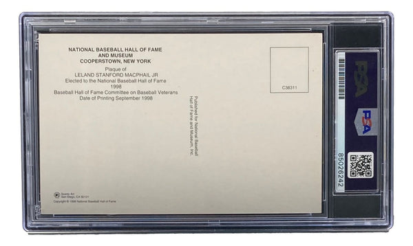 Featured is a Lee MacPhail (New York Yankees) signed 4x6 Hall Of Fame plaque card. This card has been hand signed by MacPhail and has been authenticated and encapsulated by PSA/DNA. This card would make a great addition to any sports memorabilia collection! SPECIFICATIONS Autographed By: Lee MacPhail Team: New York Yankees Sport: Baseball Authentication: Professional Sports Authenticator (PSA)