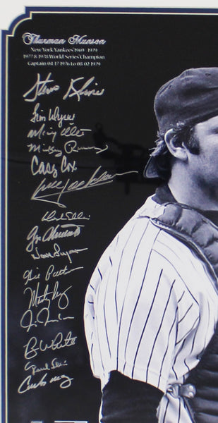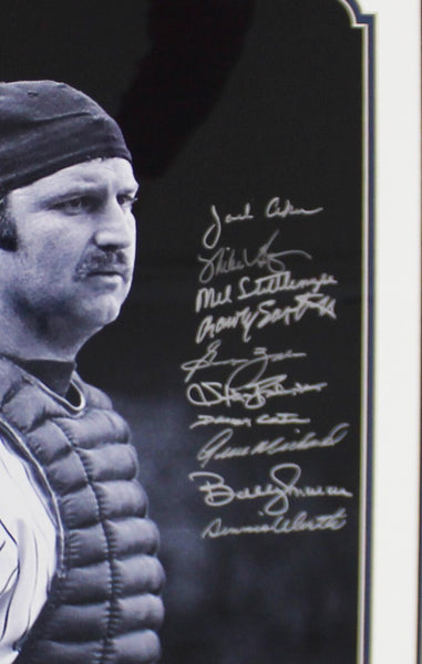 A Framed 16x20 Black & White MLB Photo with 25 Signatures hand signed by Steve Kline, Jimmy Wynn, Mickey Rivers Casey Cox, Doc Ellis, George Medich, Dave Bergman, Gil Paterson, Chris Chambliss, Roy White, Bobby Murcer, Paul Blair, Carlos May, Jack Aker, Mel Stottlemyre, George Zeber, Stan Bahnsen, Danny Carter, Gene Michael, Dennis Worth, Mike Hegan & Rawley Eastwick. The frame measures appoximately 30"x21". AUTHENTICATION: The item is tagged with a MAB Celebrity Services Hologram