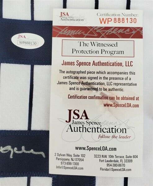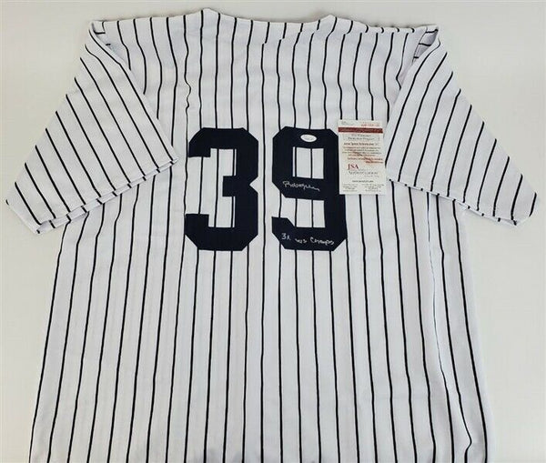 This custom on-field style autographed jersey has been personally hand-signed by Roberto Kelly of the New York Yankees. Kelly added the inscription "3x WS Champs" along with his signature. This autograph is certified by James Spence Authentication's (JSA) Witnessed Protection Program. That means that a JSA representative was present when this item was signed. It comes with the numbered hologram and matching Certificate of Authenticity.